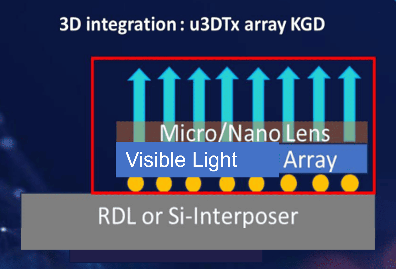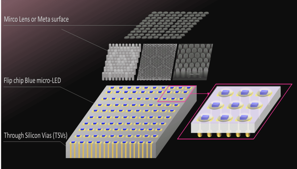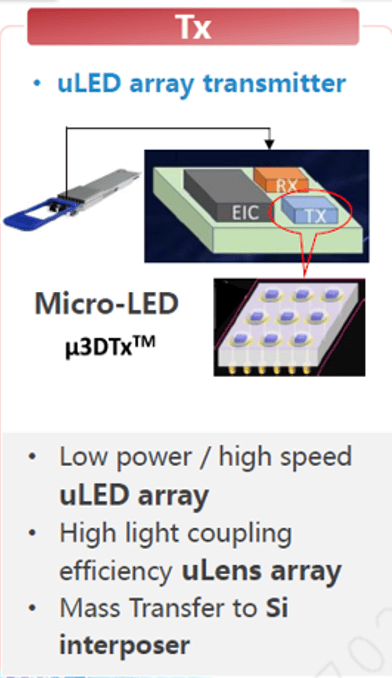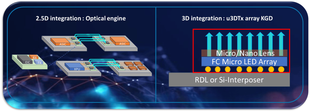 The growing demand for high-bandwidth, low-latency, and energy-efficient optical communication has accelerated the development of advanced optical engines. This proposal focuses on the development of a parallel Micro LED array on a silicon (Si) interposer for AI datacom applications. The integration aims to achieve high-density, high-bandwidth optical transmission while leveraging the manufacturability and cost-efficiency of silicon-based processes.